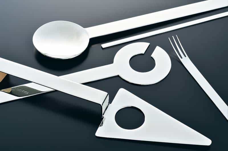 主に湾曲した面でできている一般的なカトラリーとは異なり、「TI-1」シリーズは小さな鏡がいくつもあるような趣を醸し出すデザインです。